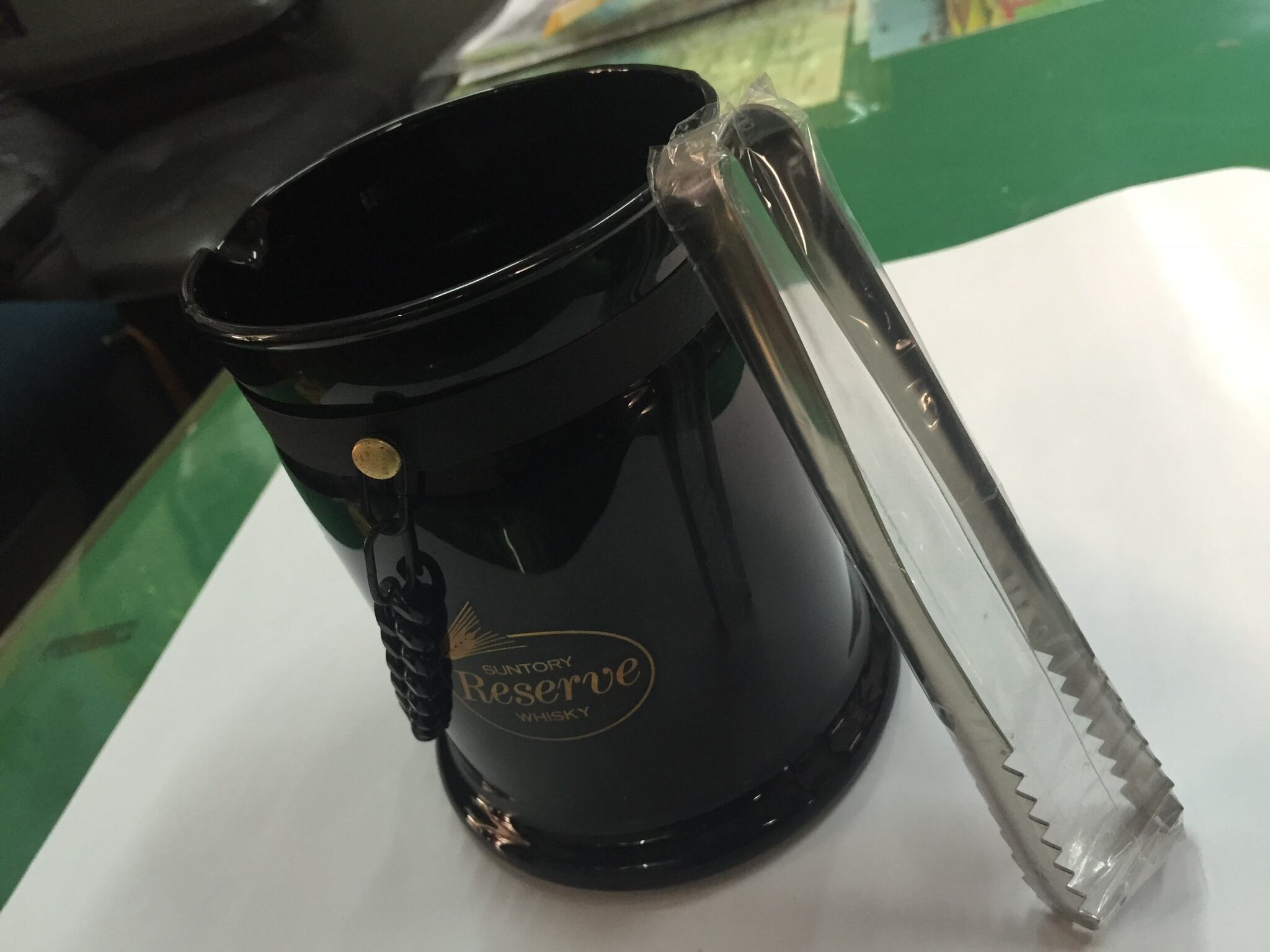 サントリー☆リザーブ☆ウィスキー専用☆アイスペール。漆黒の中にゴールドの昔のロゴが際どく映える。ウィスキーの横にはお気に入りのグッズがあると気分が違う(^^)